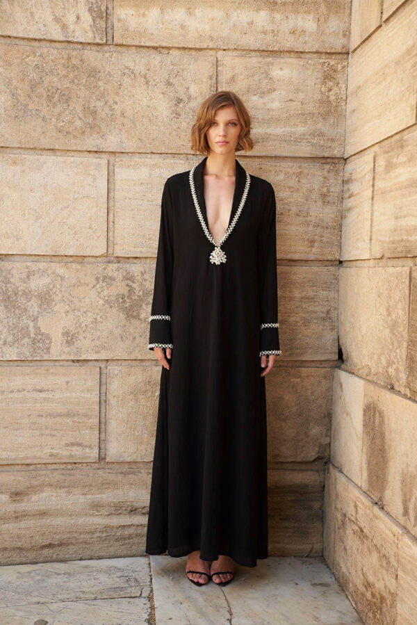 Black crystals embroidered plunging neckline lapled maxi dress