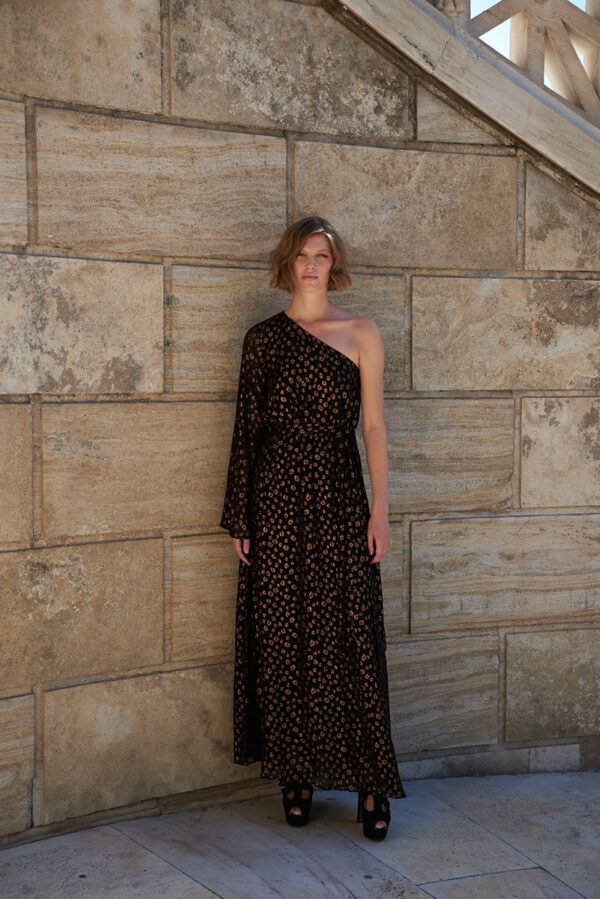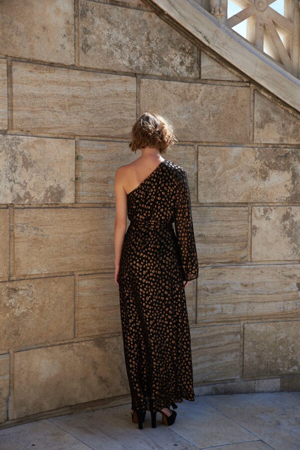 Black one off-shoulder jumpsuit with crystal embroidered cuff