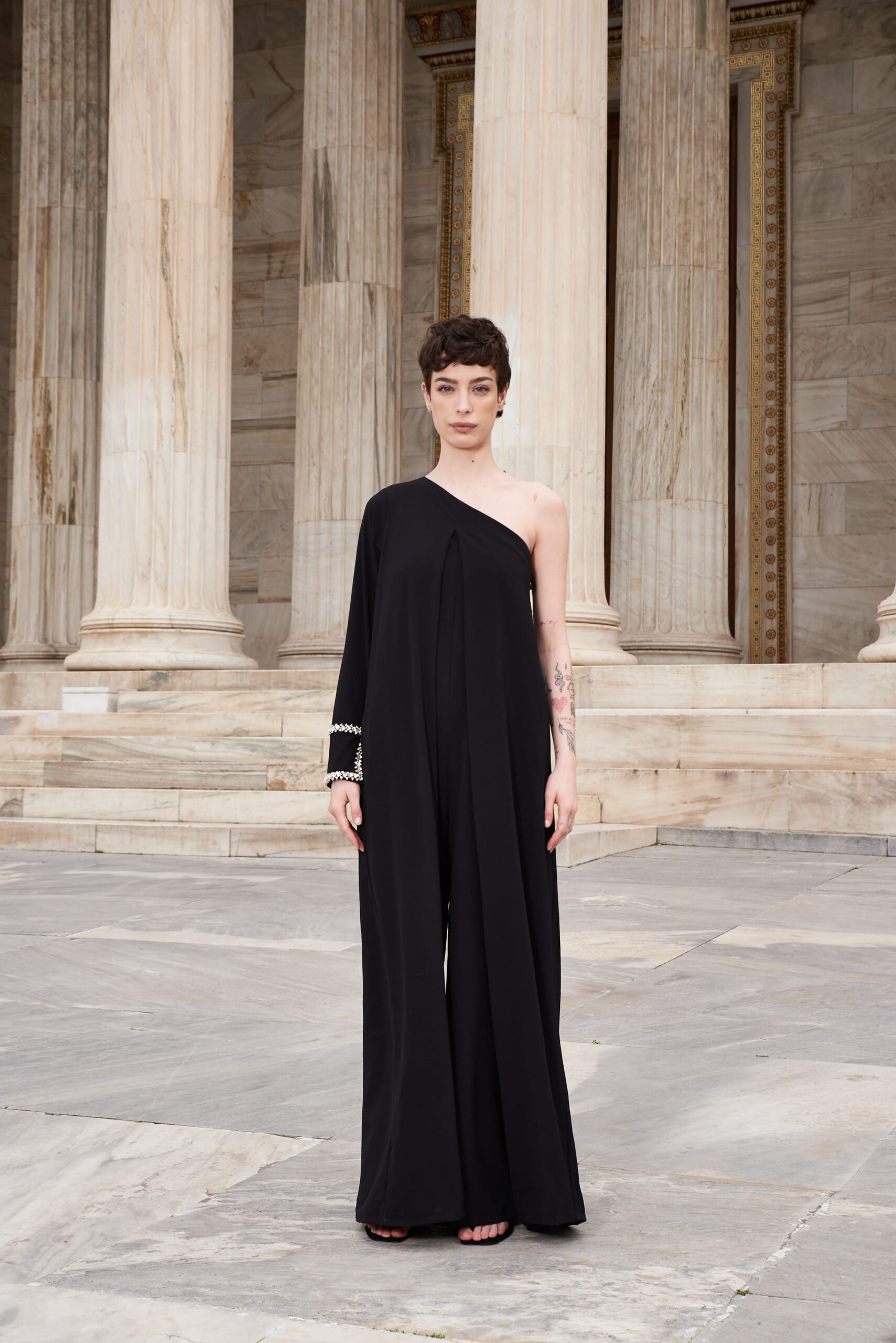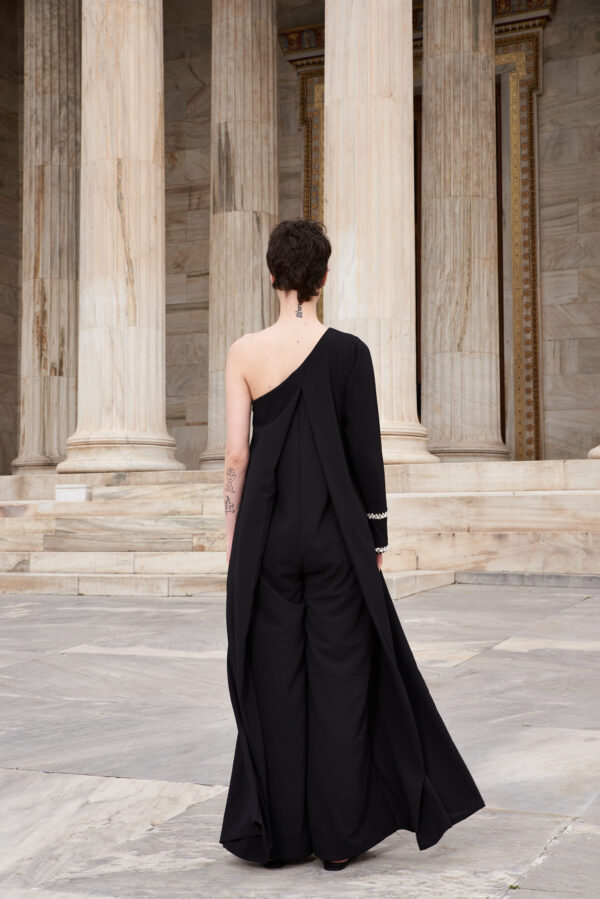 Black crepe pleated one off-shoulder jumpsuit with crystal embroidered cuff Style code : FRRILL 23 – 01