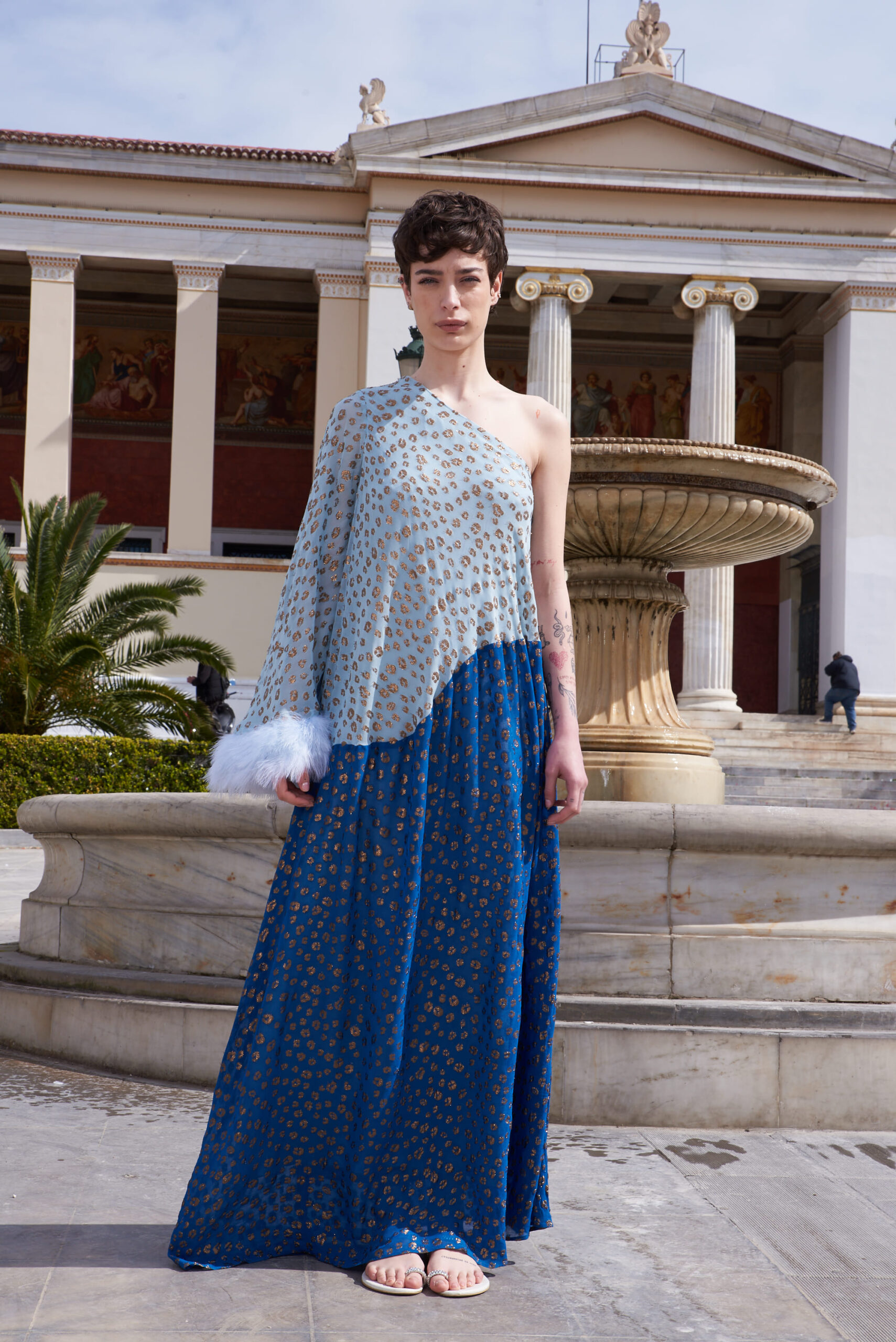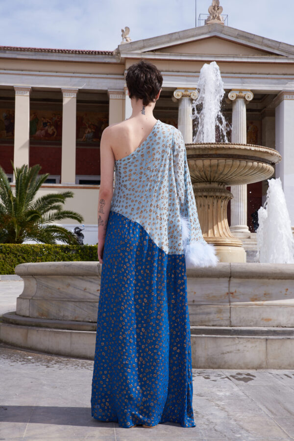 Blue leopard georgette lame one-off shoulder kaftan maxi with feather detail in sleeves