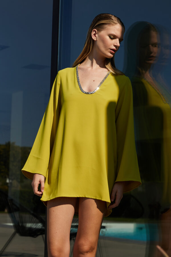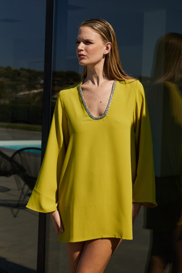 Mustard-lime Relaxed Tunic – Flowy Tunic with Flared Sleeves & Crystal Neckline