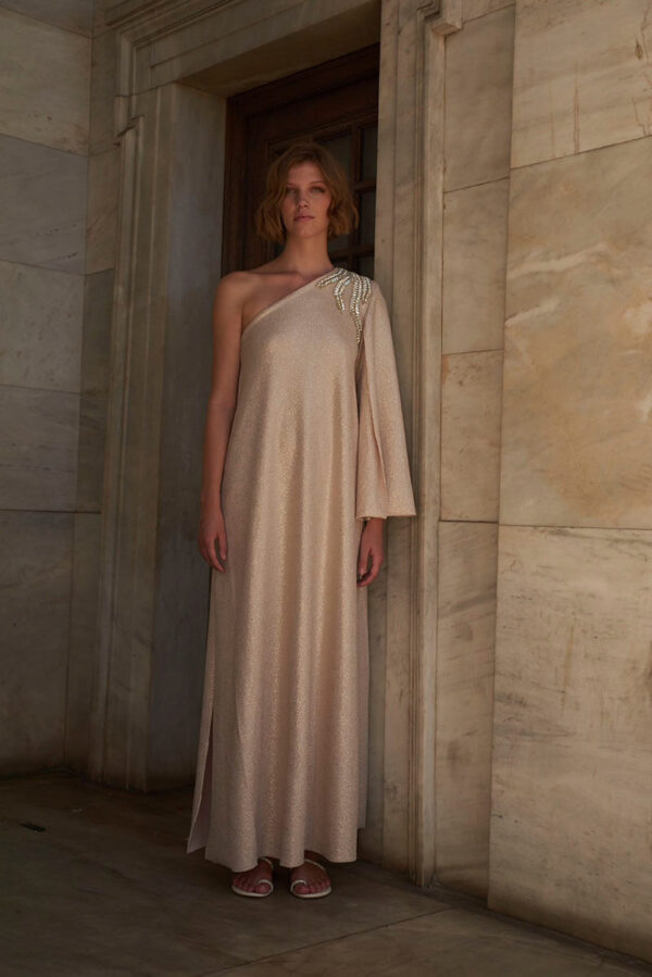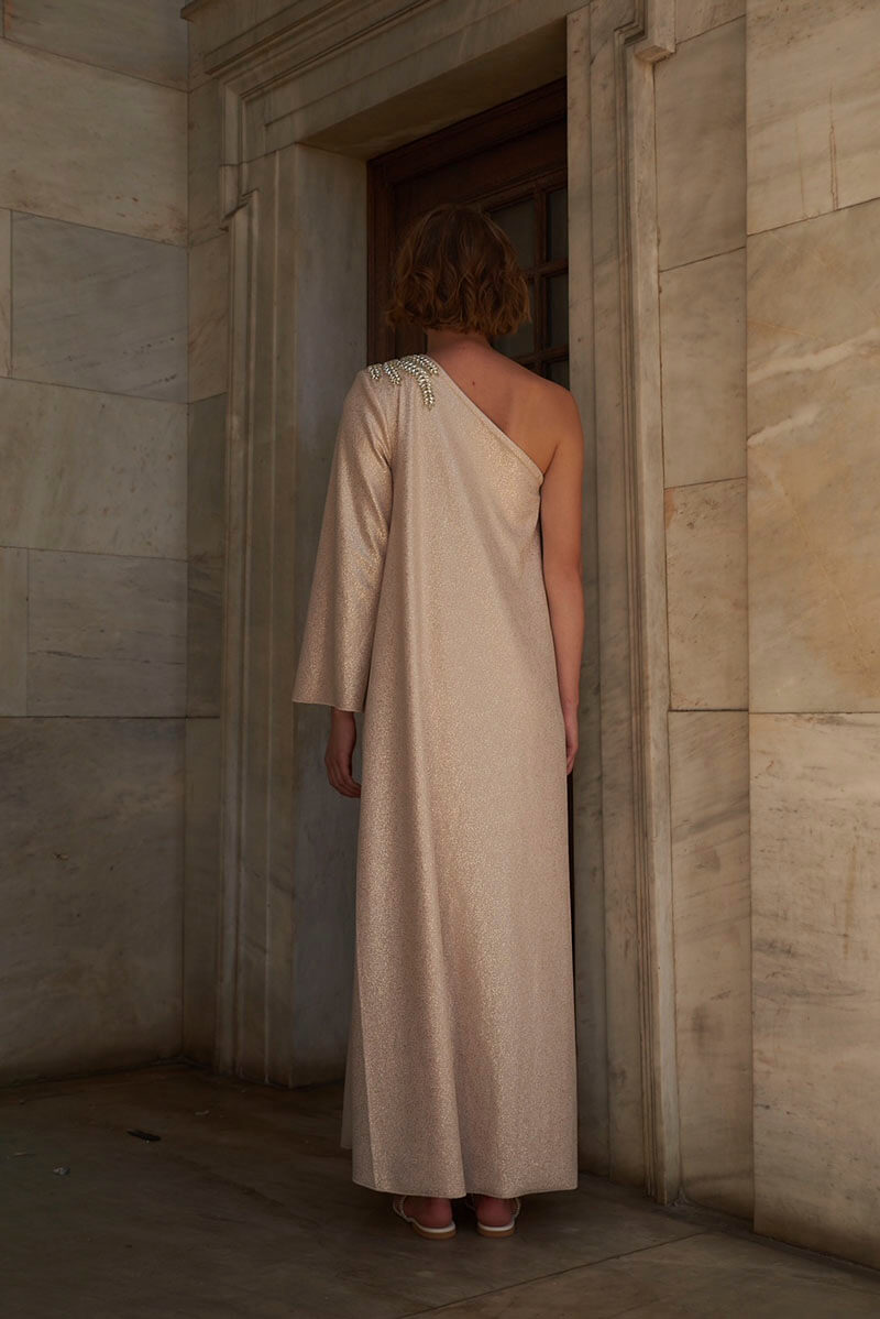 One off shoulder Shimmer lycra maxi with shoulder embellishment