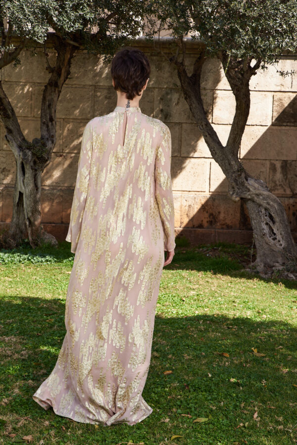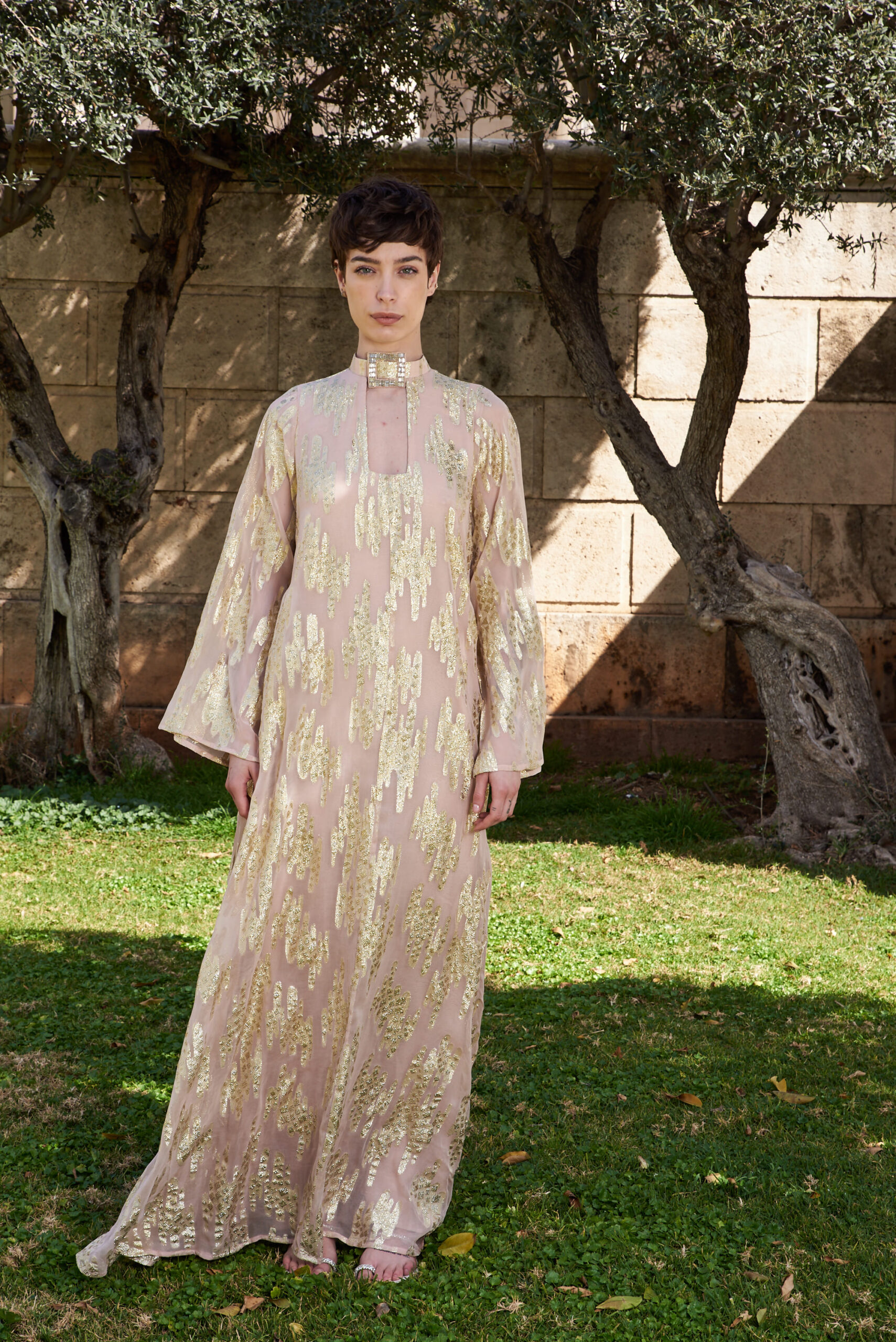 Pastel pink georgette abstract lame kaftan maxi with bell sleeves and crystal embroidered buckle on the neck
