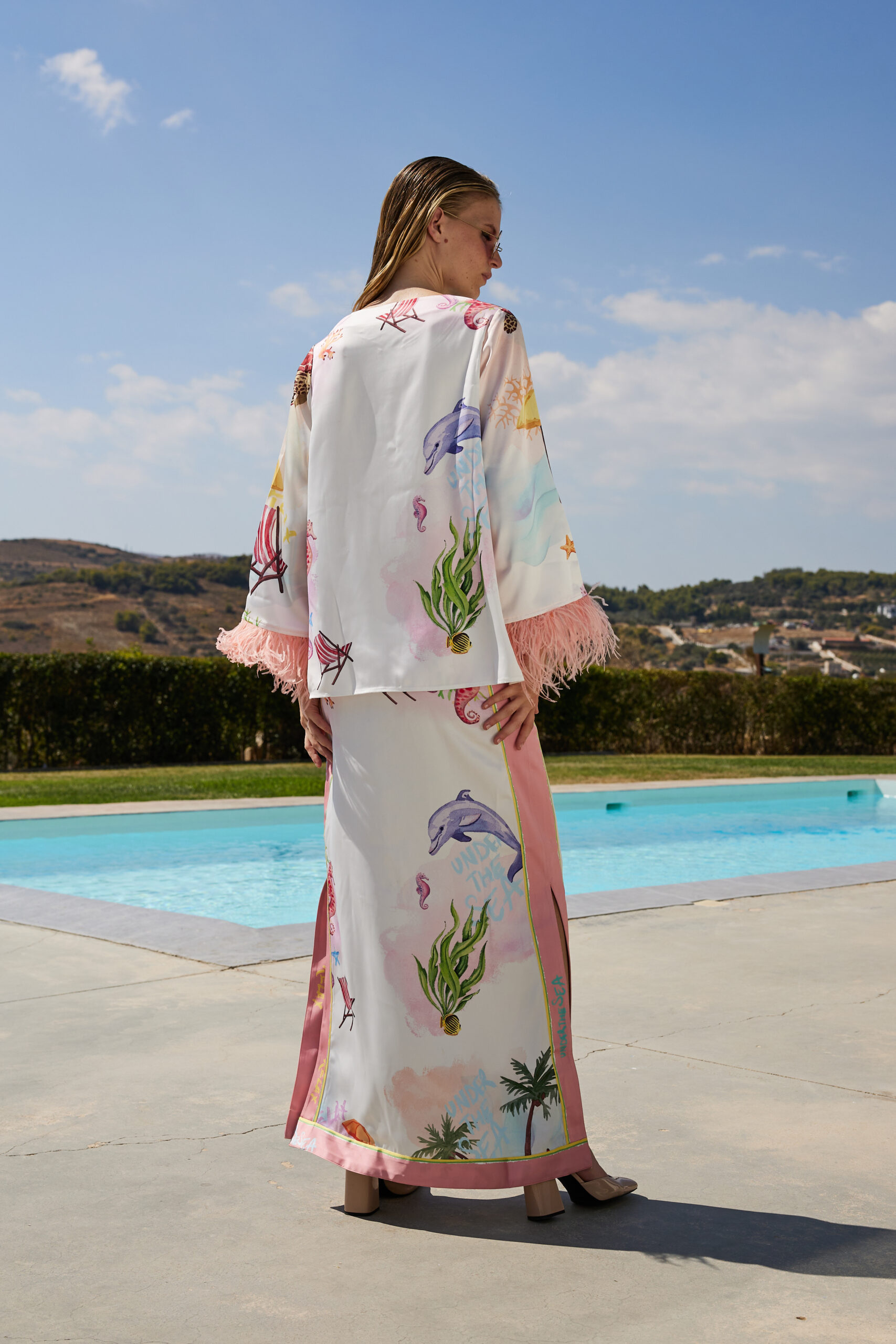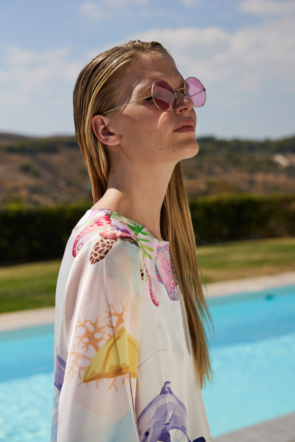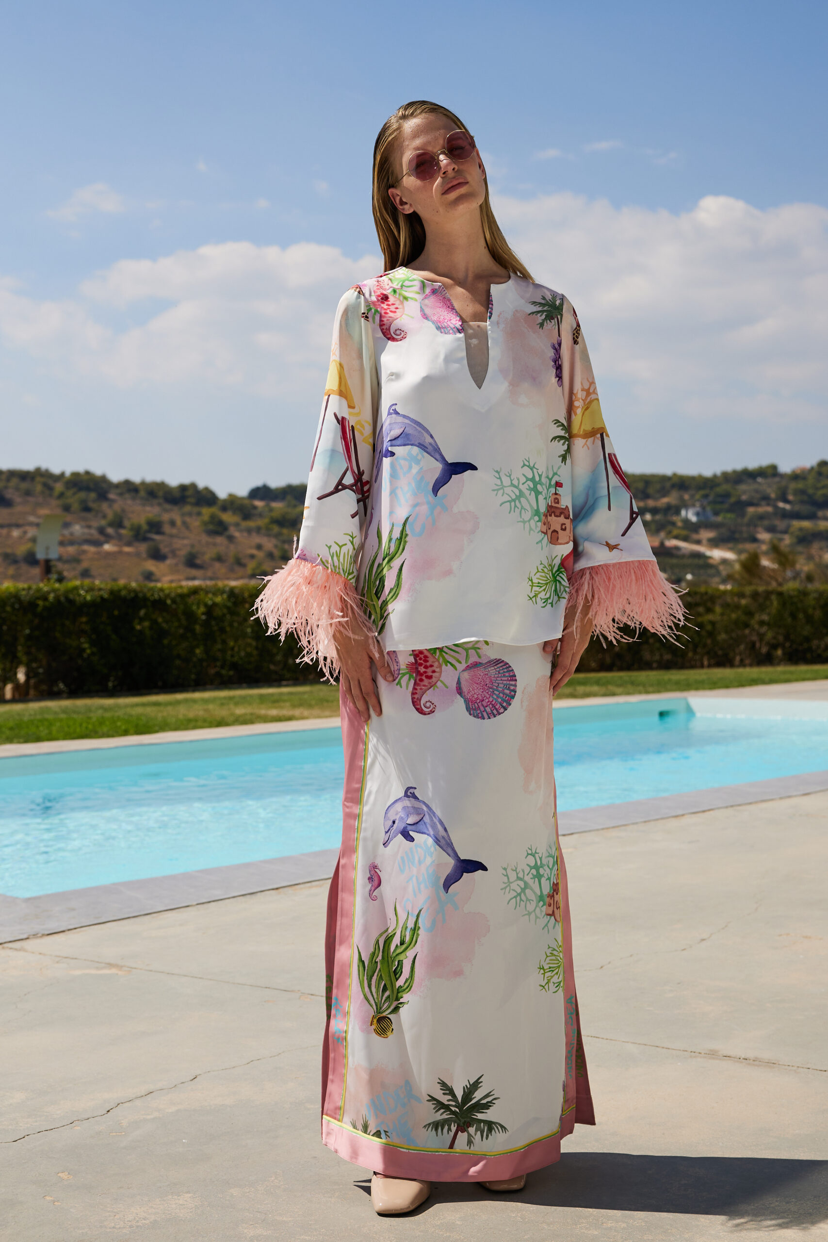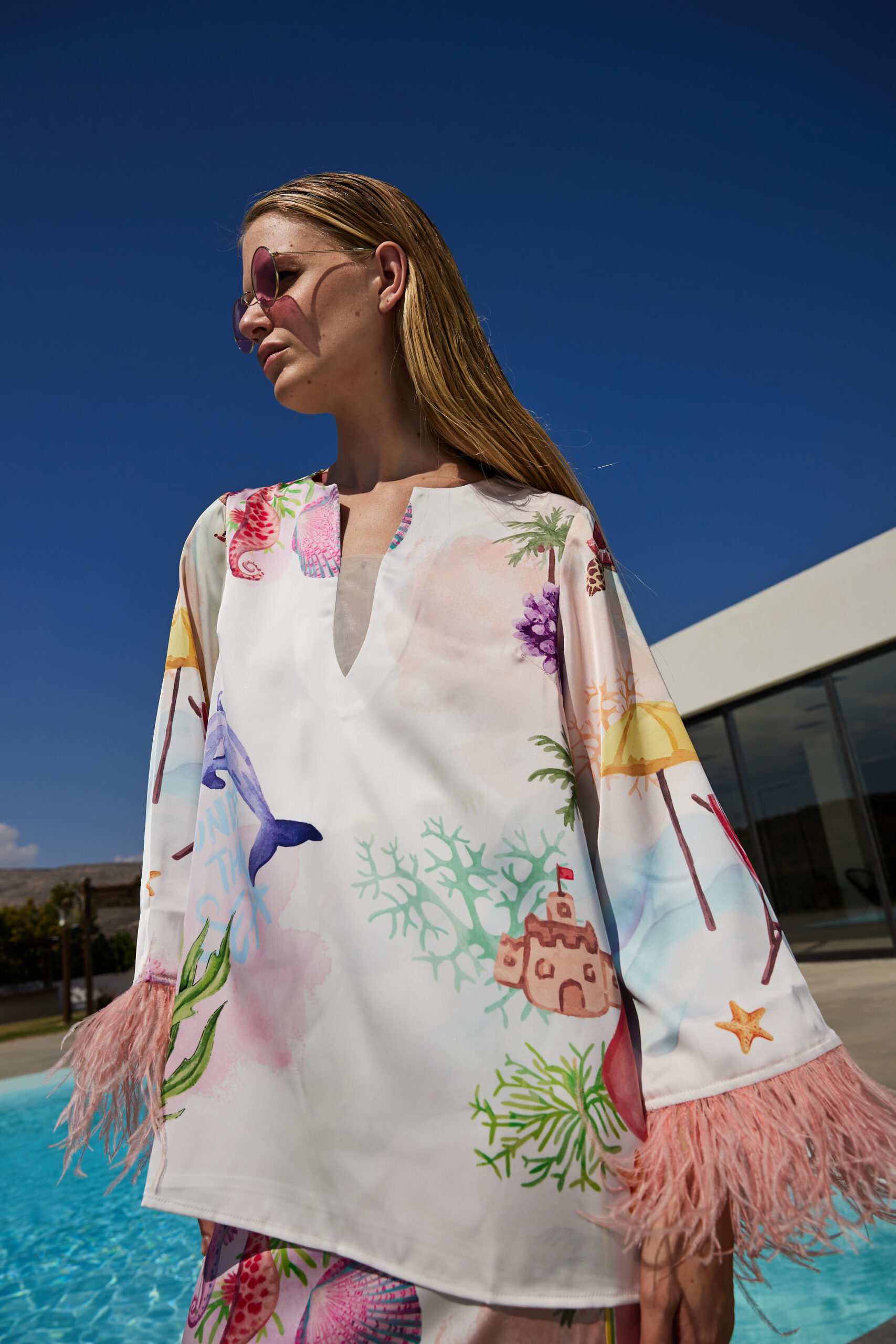 This tunic top is such a fun statement piece—it’s got a playful, beachy fantasy vibe going on! The white base acts like a canvas for that vibrant, watercolor-style print, which includes: