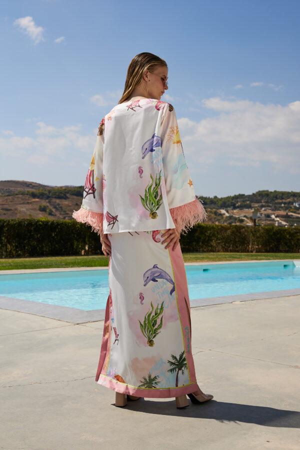 Soft blush-pink feather trim on the sleeves for that extra luxe touch